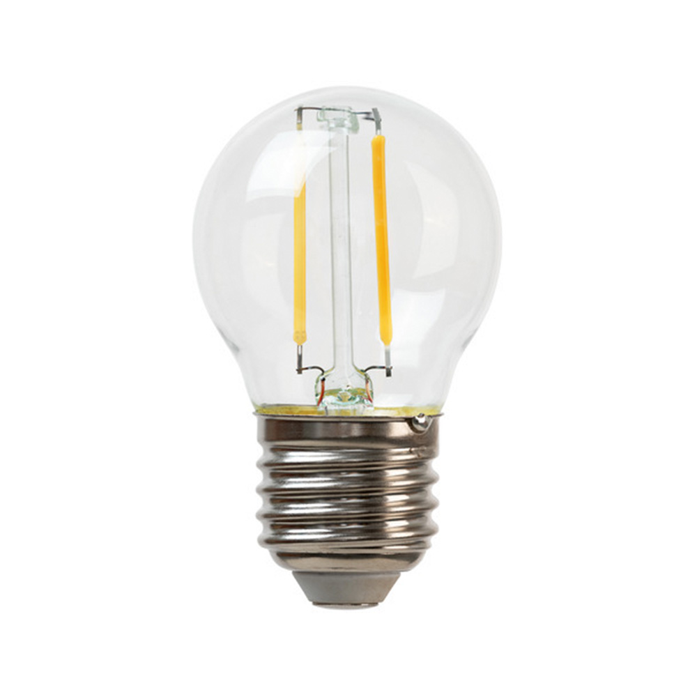 Лампа светодиодная стандарта G45 E27 с потребляемой мощностью 2 Вт. По степени интенсивности излучаемого света заменяет традиционные лампы мощностью до 25 Вт. Является декоративной и используется в гирляндах и светильниках как внутри, так и снаружи помещений. Длительность работы – до 25 тысяч часов. Не содержит вредных для экологии соединений.