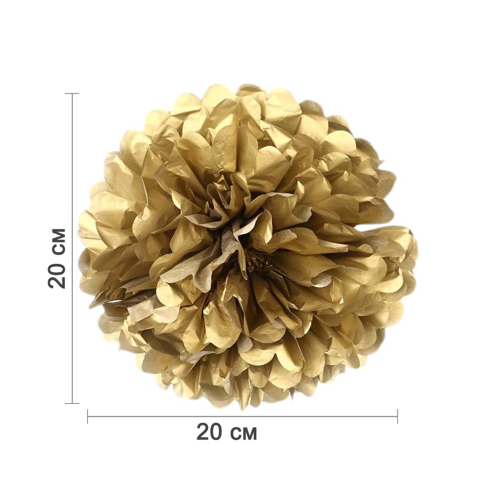Золотой бумажный помпон диаметром 20 см — стильное и лёгкое украшение для праздников, фотозон, витрин и интерьера. Отлично подойдёт для дней рождений, свадеб, вечеринок и тематических мероприятий.
