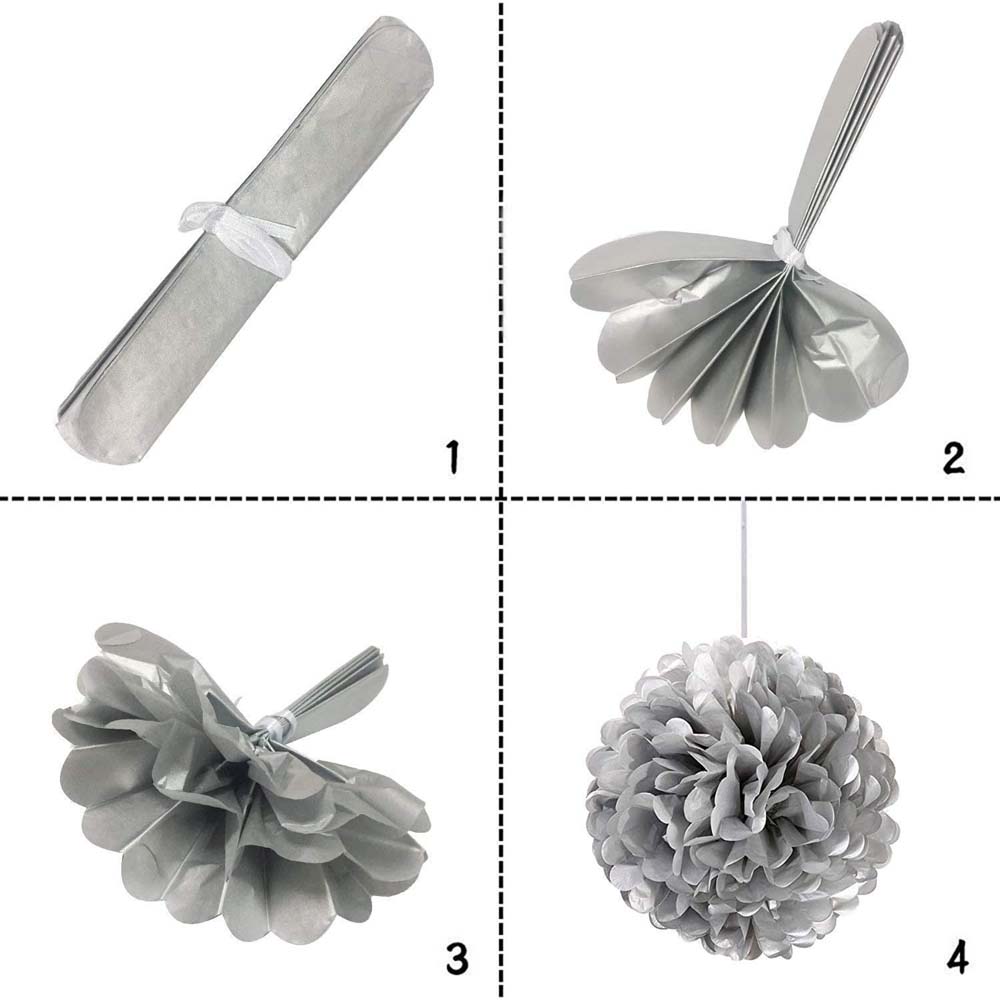 Серебряный бумажный помпон диаметром 45 см — стильное и лёгкое украшение для праздников, фотозон, витрин и интерьера. Отлично подойдёт для дней рождений, свадеб, вечеринок и тематических мероприятий.
