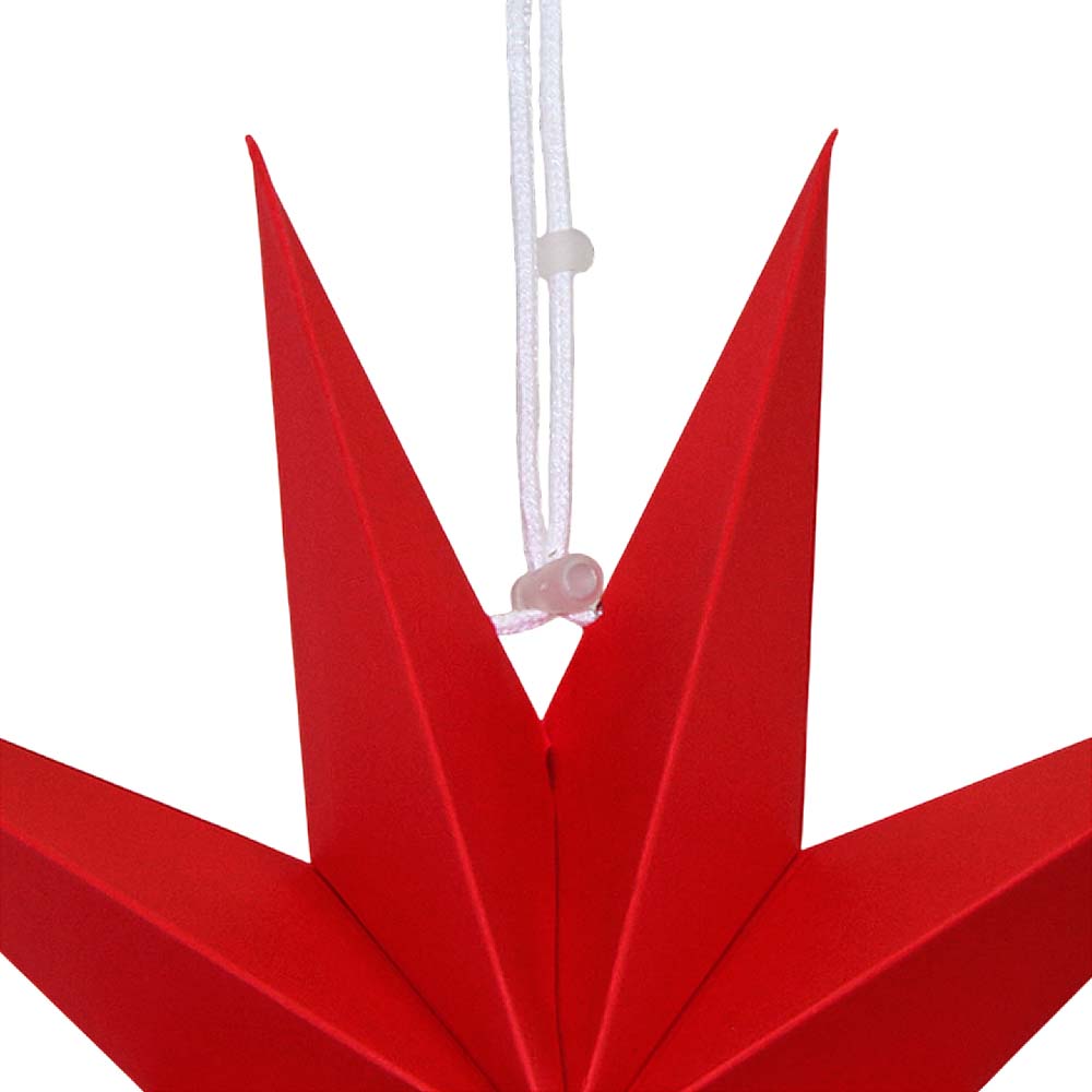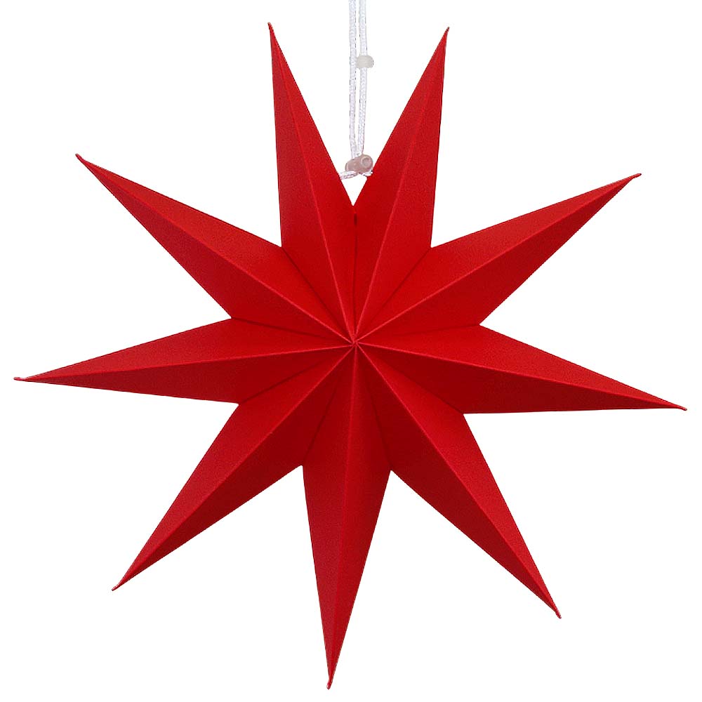 Объёмная декоративная звезда из картона диаметром 30 см с 9 лучами. Оснащена встроенным шнурком для подвешивания. Поставляется в компактном сложенном виде и быстро собирается: специальный шнурок при затягивании придаёт изделию объём и фиксирует форму. После сборки звезда остаётся устойчивой без дополнительных креплений и может использоваться многократно.