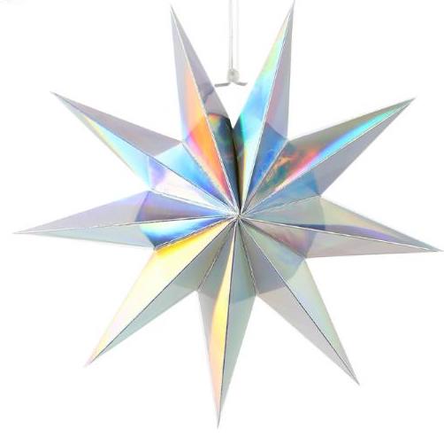 Объёмная декоративная звезда из картона диаметром 30 см с 9 лучами. Оснащена встроенным шнурком для подвешивания. Поставляется в компактном сложенном виде и быстро собирается: специальный шнурок при затягивании придаёт изделию объём и фиксирует форму. После сборки звезда остаётся устойчивой без дополнительных креплений и может использоваться многократно.