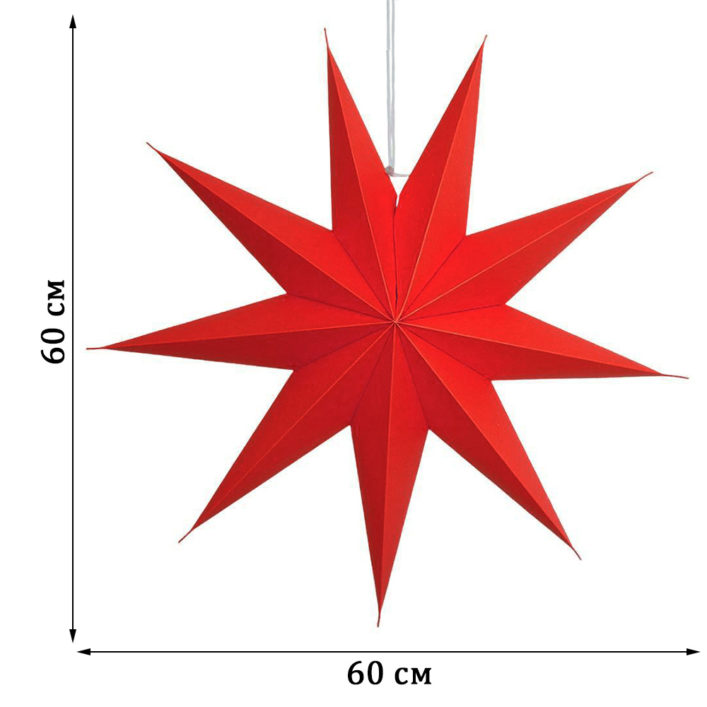 Объёмная девятиконечная звезда 60 см — декоративный элемент для интерьера и праздничного оформления. Лёгкая интерьерная звезда из картона хорошо держит форму и создаёт выразительный объём. Поставляется в сложенном виде, в комплекте шнур для фиксации объёма и подвеса.