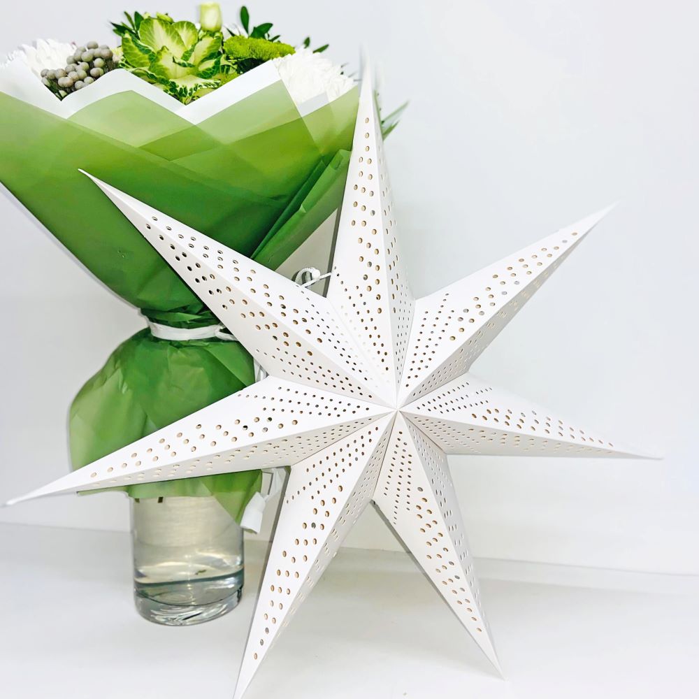 Воздушная семиконечная звезда из плотной бумаги с изящным орнаментом в виде кружочков. Белоснежный цвет и аккуратная перфорация создают мягкое свечение и добавляют интерьеру лёгкость и праздничное настроение.